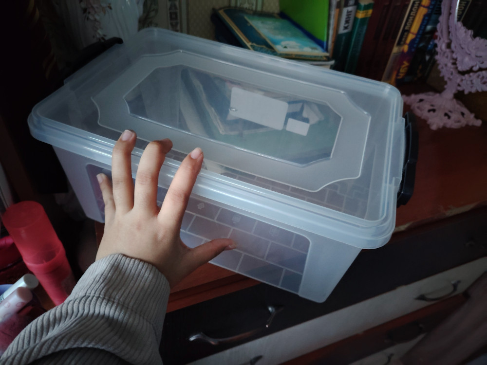 "Контейнер хранения «StarPlast»" (23,5 × 35,5 × 16 см; 9л.)прозрачный, что очень удобно, так как можно увидеть содержимое. Крышка имеет углубления, что позволяет поставить один контейнер на другой. Ручки на самой крышке нет. На крышке - сбоку выступы, по бокам самого контейнера - ручки, которыми можно защёлкнуть крышку. На моём контейнере ручки натягиваются на защёлки с трудом, даже натягиваю их, но боюсь, что может треснуть. Поэтому вряд ли буду пользоваться защёлками. Однако крышка хорошо закрывается и без защёлкивания. Поэтому считаю, что этот контейнер хорошего качества. Но за защёлки всё же оценку снижу, хотя и особого значения они не имеют. Хороший контейнер.