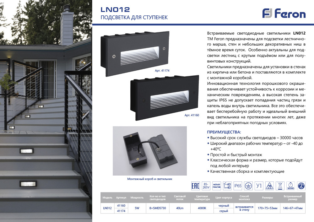 Встраиваемый светодиодный светильник LN012 Feron предназначен для подсветки лестничного марша в темное время суток, когда ступени лестницы плохо видны и это может затруднять перемещение и даже стать причиной падения.