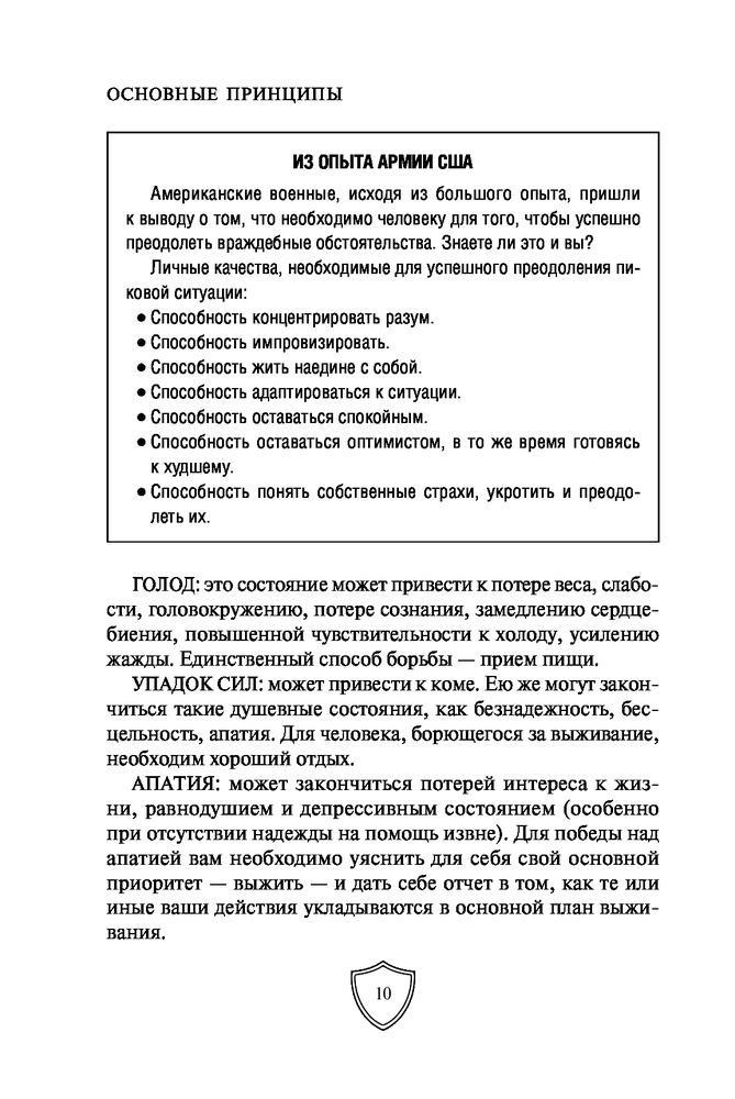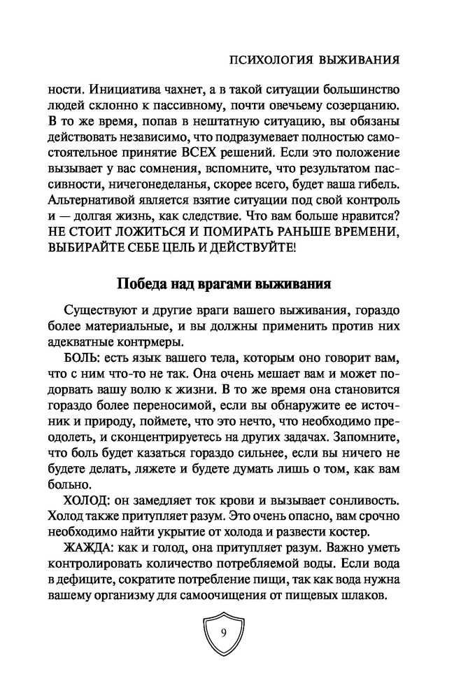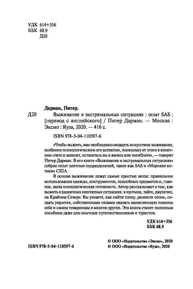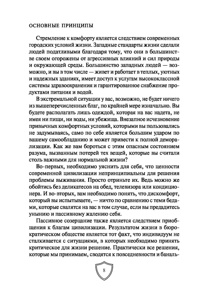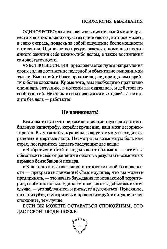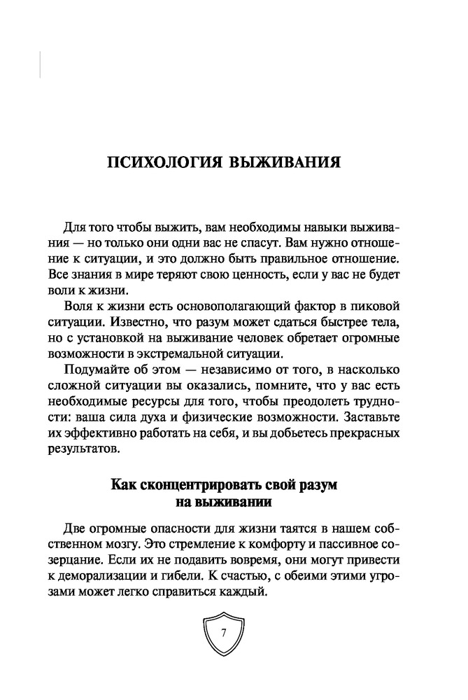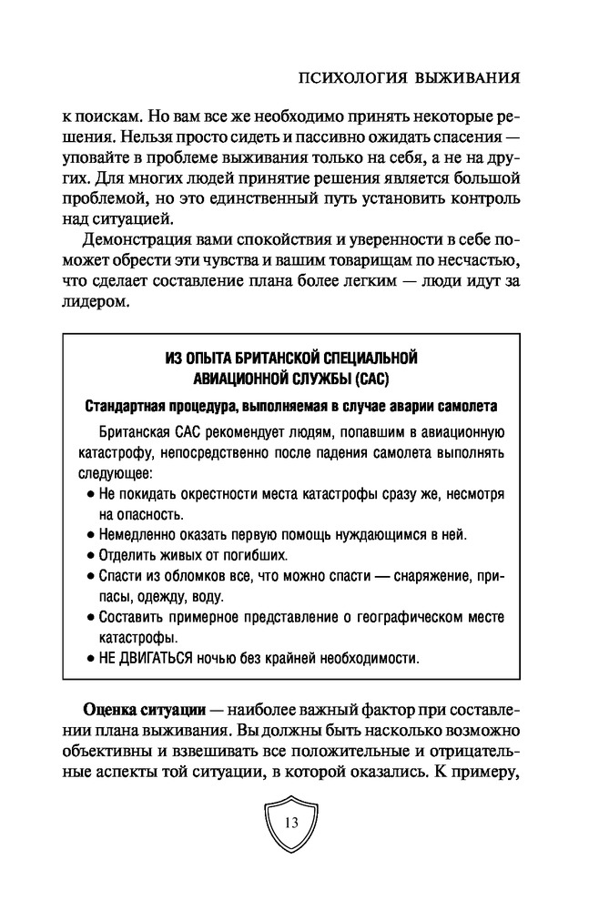 Выживание в экстремальных ситуациях. Опыт SASВ данный момент этот товар отсутствует в продаже. Возможно, у нас найдется аналогичный или похожий товар здесь. Серия: Школа выживания. Учись у спецназа! Карманный формат «Чтобы выжить, вам необходимо овладеть искусством выживания, особенно психологическим его аспектом, поскольку от этого в конечном счете и зависит, останетесь вы в живых или погибнете», — говорит Питер Дарман. В его книге «Выживание в экстремальных ситуациях» собран опыт элитных подразделений, таких как SAS и «Морские котики» США. В основе выживания лежат самые простые вещи: правильное использование одежды, инструментов, подсобных предметов и, главное, ваша психологическая готовность. Автор рассказывает о том, как выжить в различных нештатных ситуациях: в пустыне, тайге, джунглях, на Крайнем Севере. Вы узнаете, как найти пищу, развести огонь, создать укрытие, собственными силами оказать медицинскую помощь себе и своим товарищам и многое другое. Эта книга станет полезным пособием даже для опытных путешественников и туристов. |