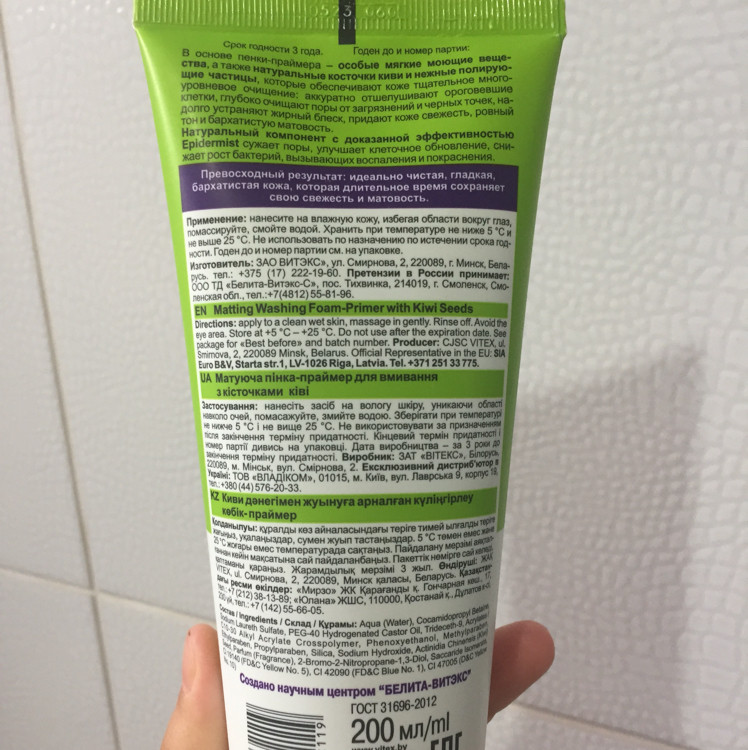 Хороший гель. Приятный аромат киви (немножко химозный), не сушит, не стягивает кожу. Если немного вспенить его руками, а затем нанести на лицо, то будет пениться хорошо. Никаких раздражений не вызвал, кожа в хорошем состоянии. Купила в паре с кремом из этой же серии. Не сказала бы, что отлично матирует (в основном, кожа остаётся матовой 2-3 часа). Буду тестировать дальше) Мой тип кожи: нормальный, но летом комби.