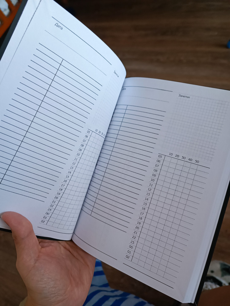 В целом, неплохой ежедневник. Приятная на ощупь матовая обложка, не очень плотная, примерно, как картон 250г/м. Страницы все одинаковые: дата, заметки, таблица (по-моему, временная, как я поняла). Удобно что-то планировать на день по времени, отметить занятое время галочкой.