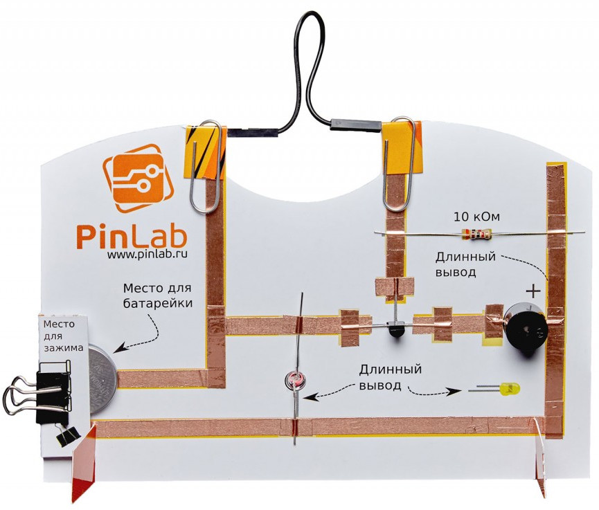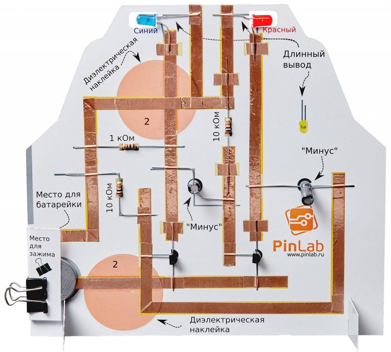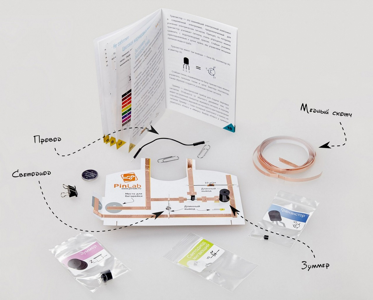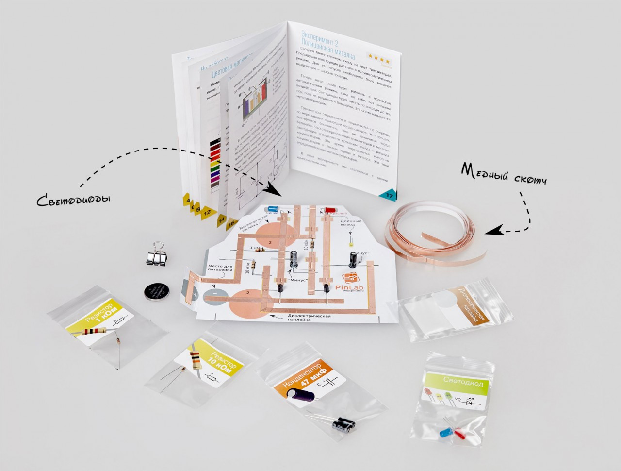 • электронные компоненты. В набор входят различные компоненты — это резисторы, транзисторы, конденсаторы, различные датчики, медный скотч и прочее;