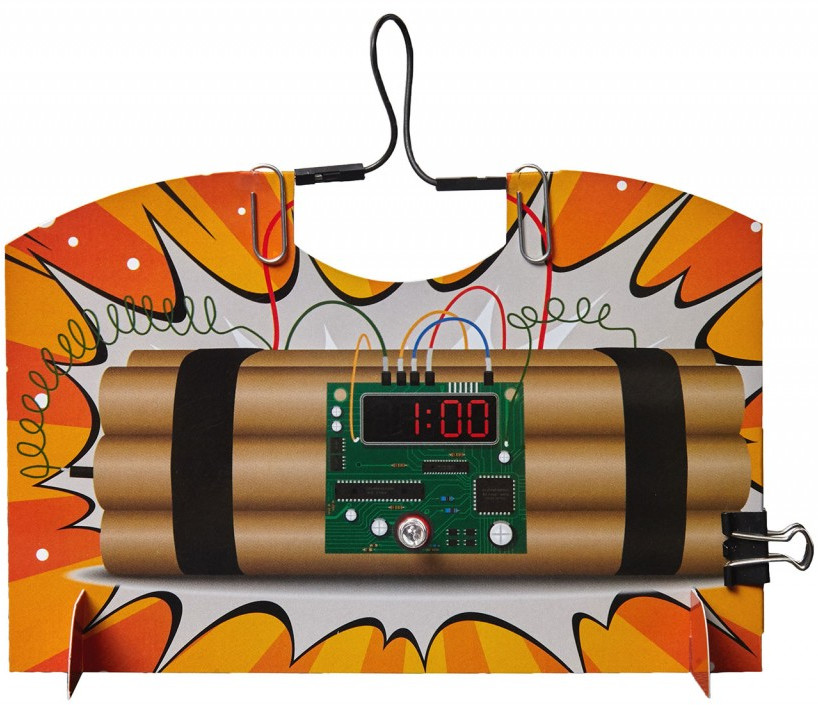 Бомба — совершенно безопасное устройство, по внешнему виду напоминающее бомбу. Красный мигающий светодиод сигнализирует о наличии электрического питания. При извлечении провода раздается звуковой сигнал.