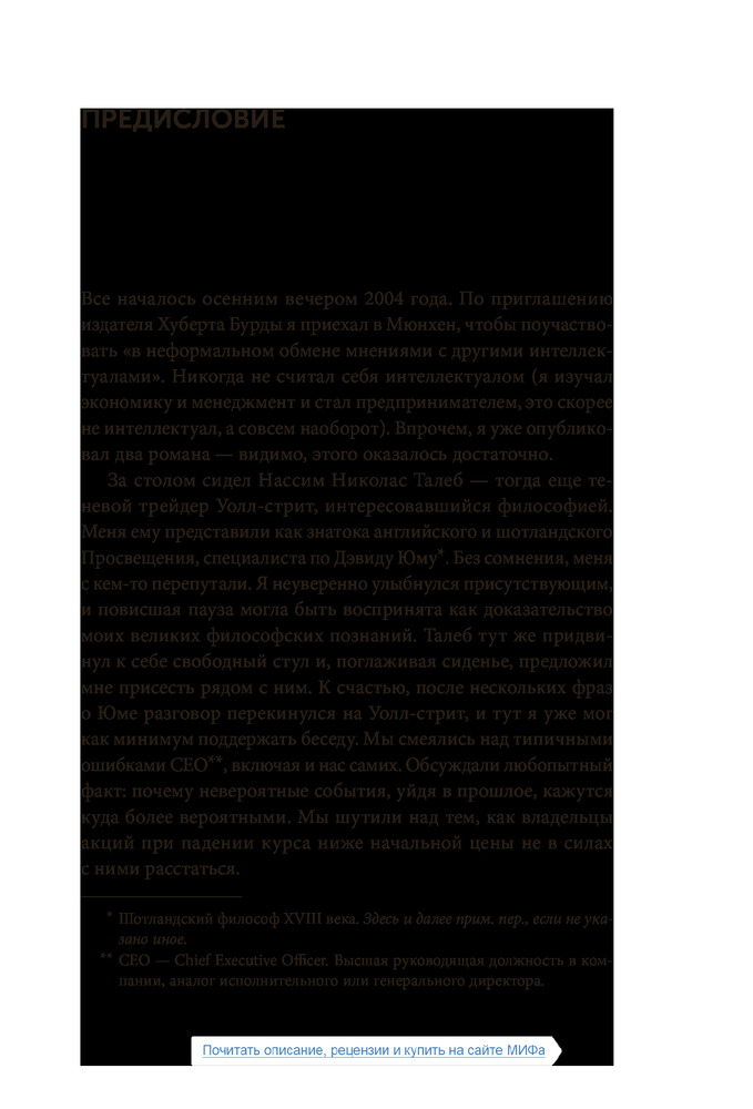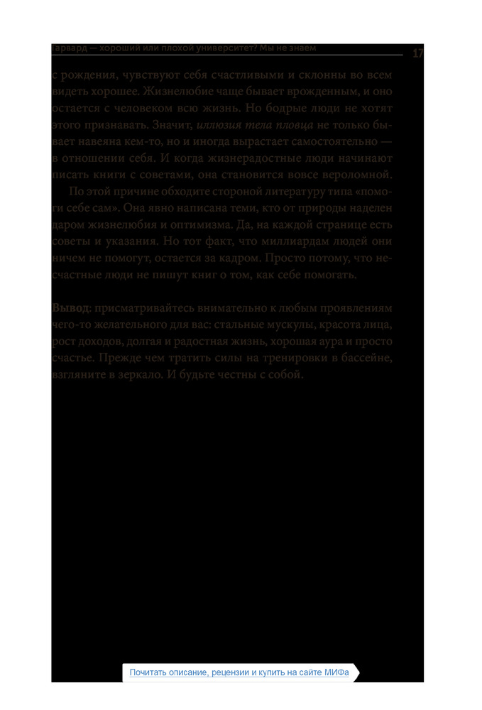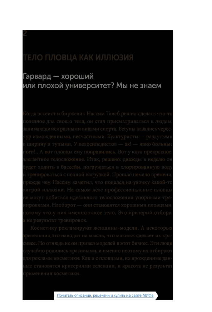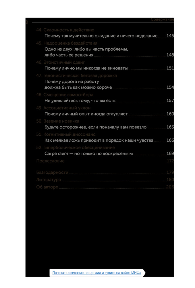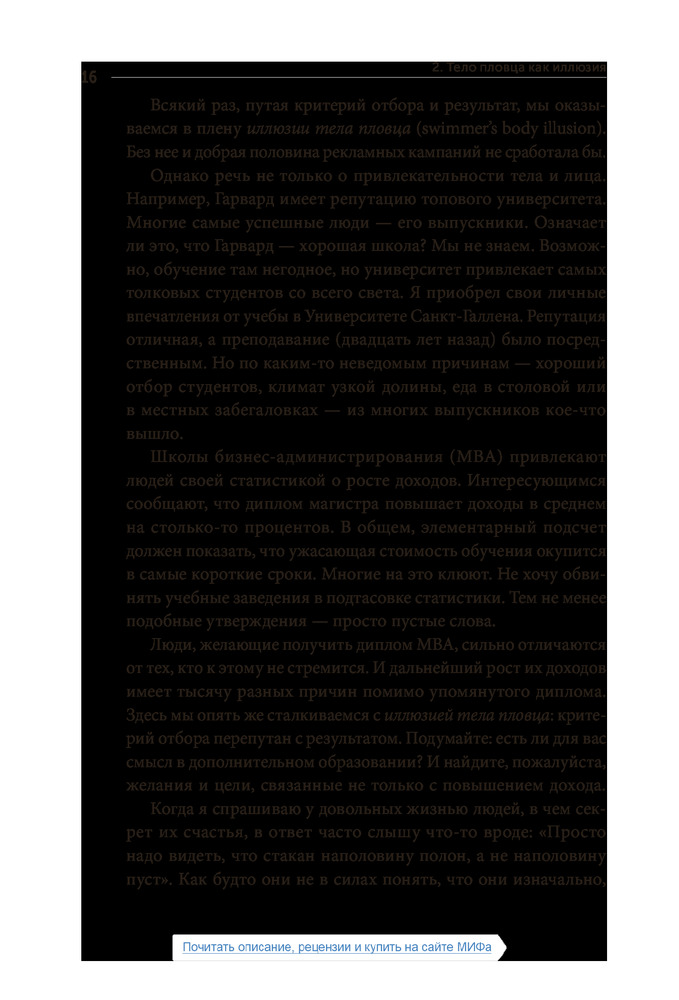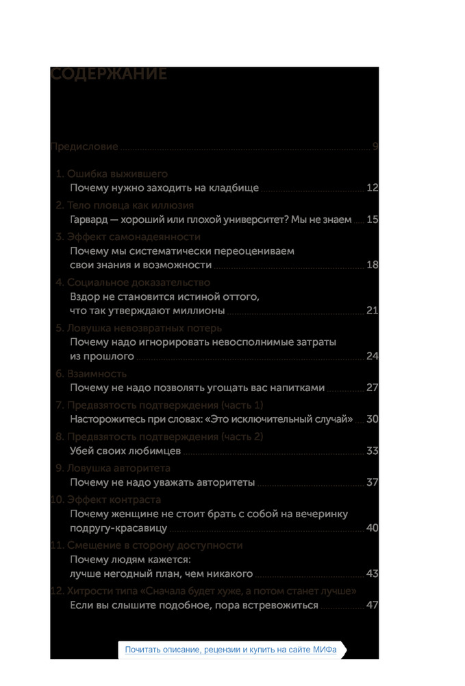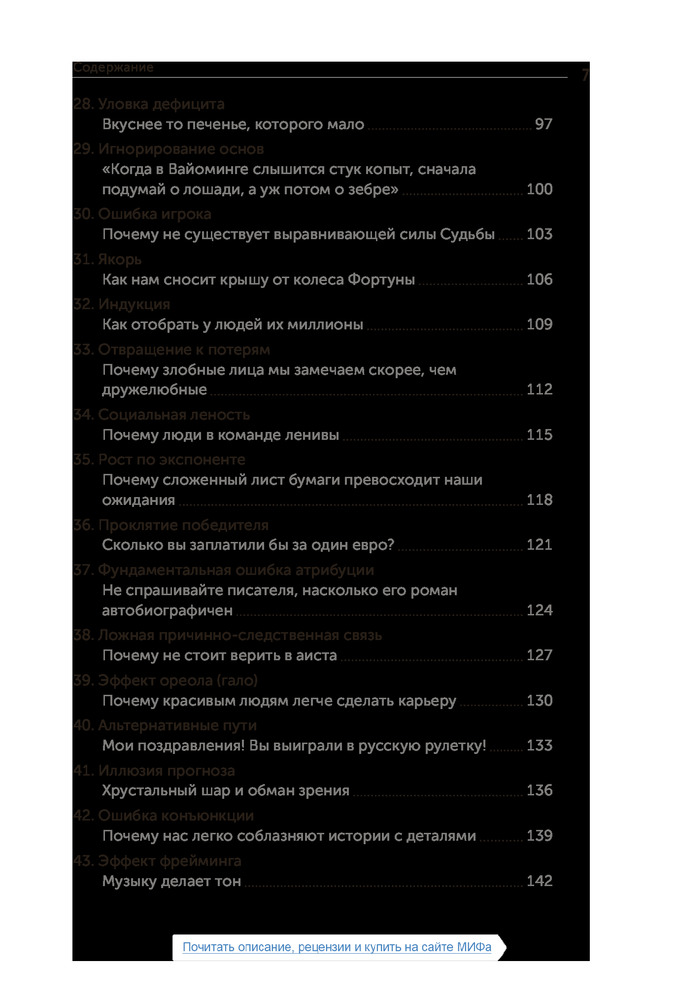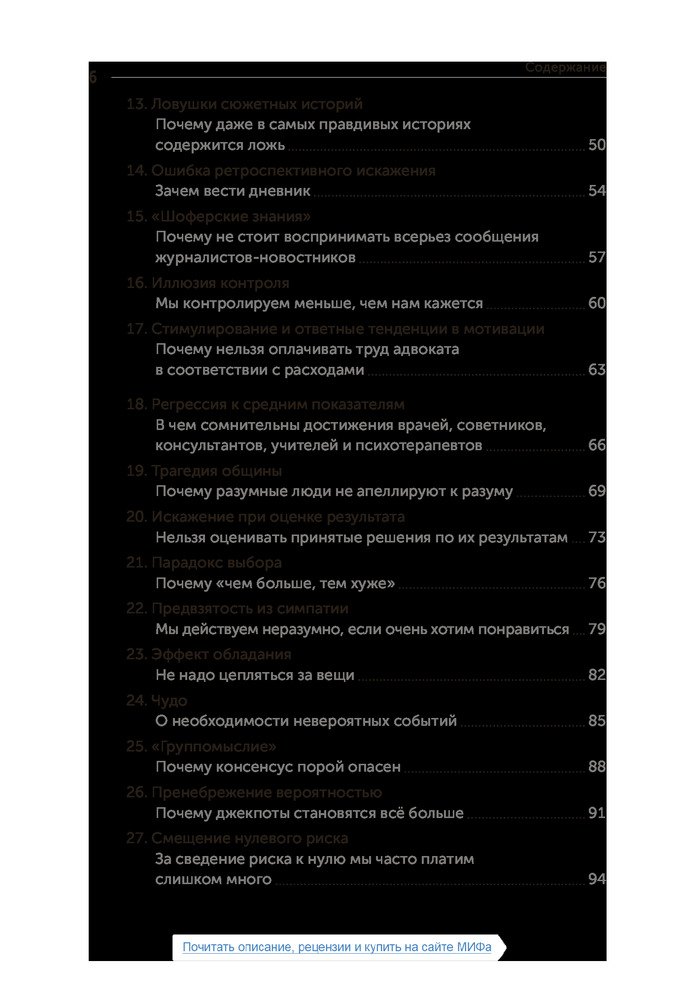 «Наше тело во многом устроено безошибочно. Сердце, мышцы, дыхание и иммунная система функционируют достаточно хорошо. Почему же именно мозг совершает ляп за ляпом? По своему физическому строению мы остаемся охотниками и собирателями в одежде от Hugo Boss (или от H&M — как вам больше нравится). Что же существенно изменилось за прошедшие тысячелетия? Мир, в котором мы живем.».