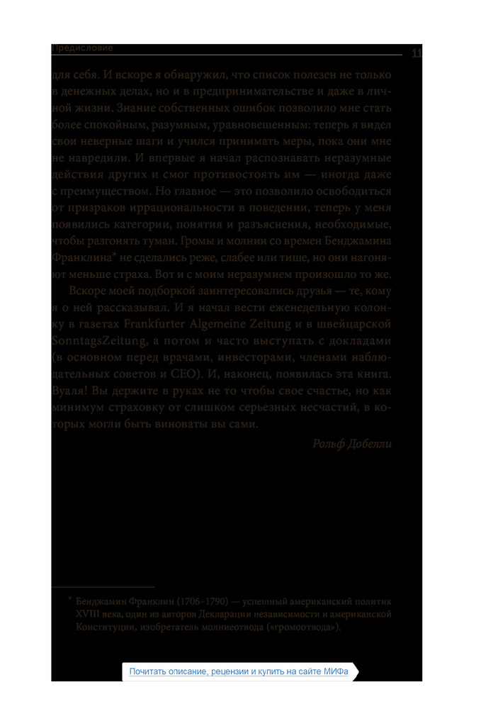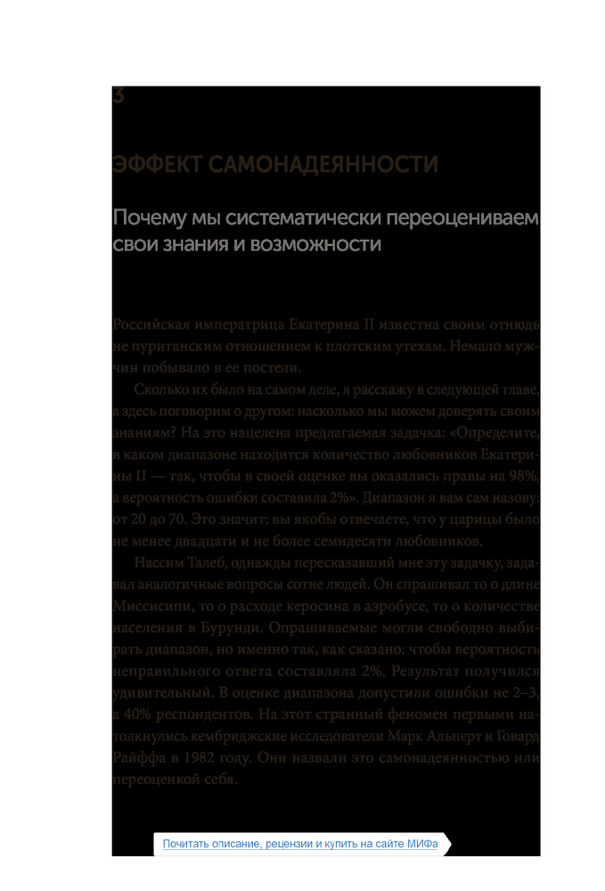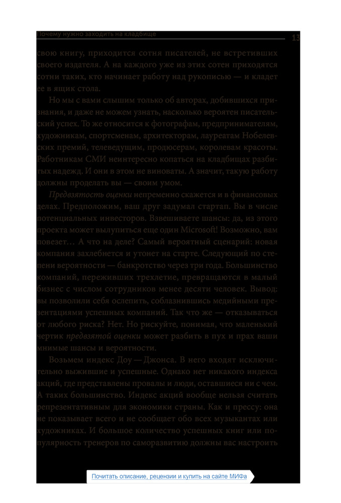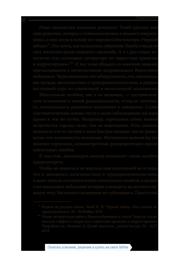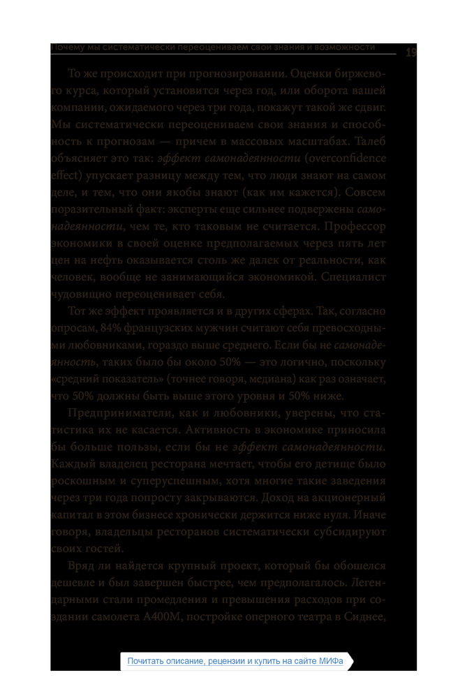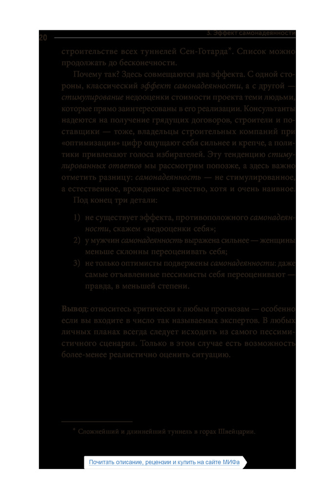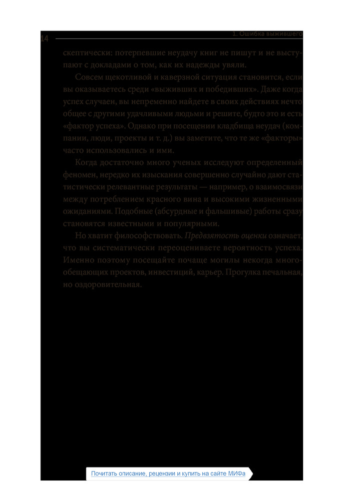 «Фильм был просто отвратным. Через час я шепнул на ухо жене: «Давай пойдем домой». Она ответила: «Ну нет. Мы что, зря отдали тридцать евро за билеты?» «Это не аргумент, — протестовал я, — деньги уже потеряны. Ты попалась в ловушку невозвратных потерь». «А ты вечно носишься со своими ментальными ошибками», — сказала она.».