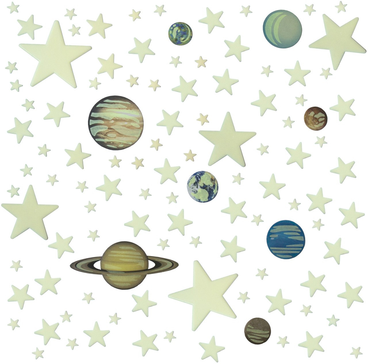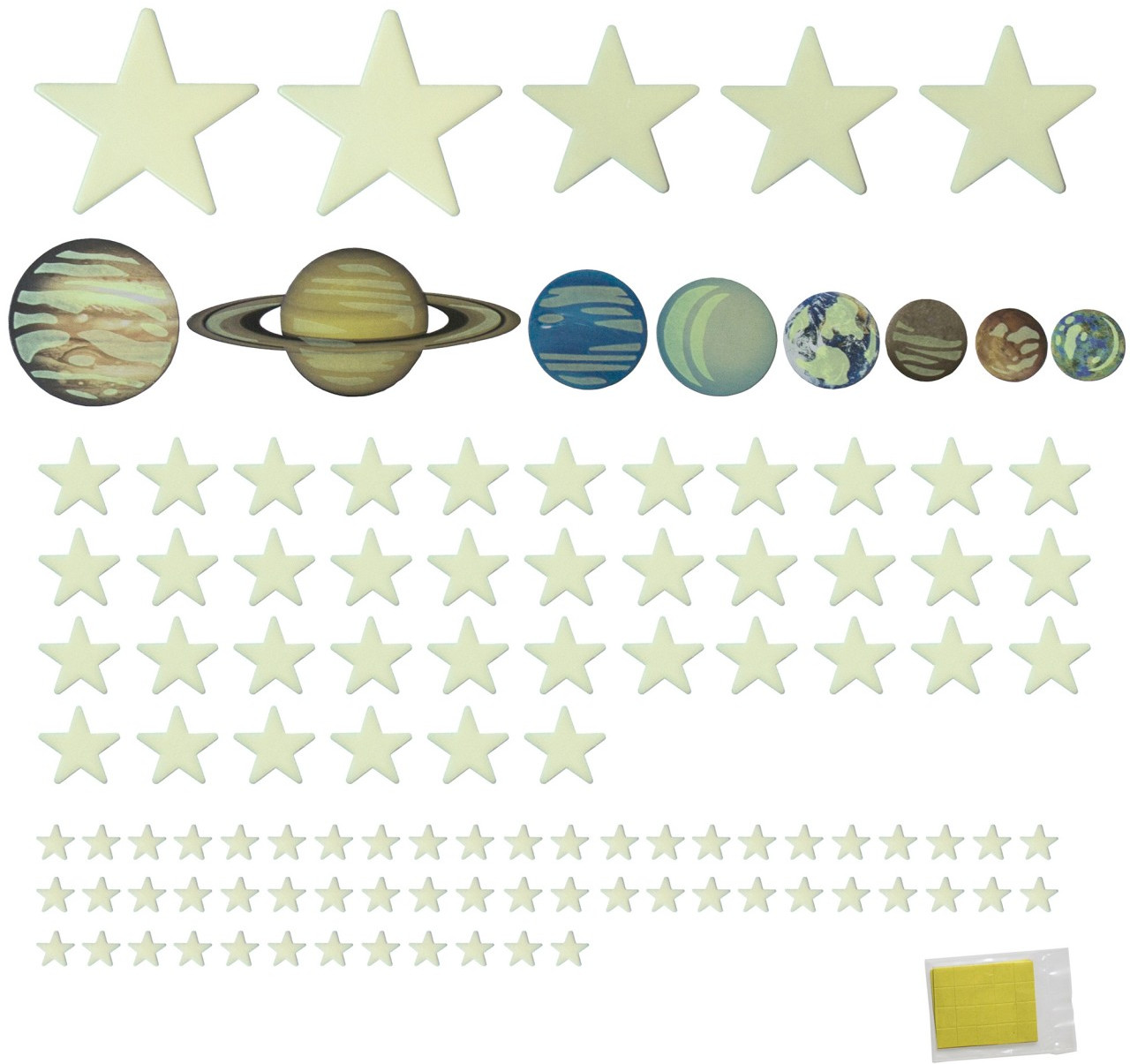 *Хорошо клеится на стены за счёт двустороннего скотча, который есть в наборе. *Снимаются тоже без повреждений стены, у нас стены покрашенвые изветской. *Светятся очень ярко первые пол-часа. *Набор огромный - мы смогли обклеить 2 стены и хватило на много созвездий. *Заряжаются как от солнечного света так и от света лампы/фонарика.