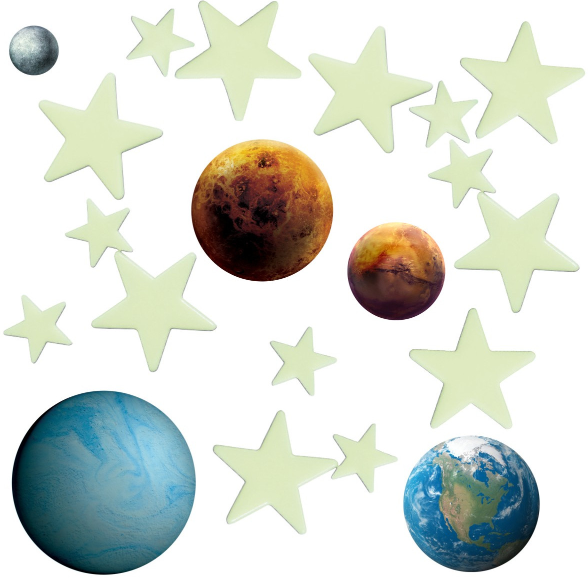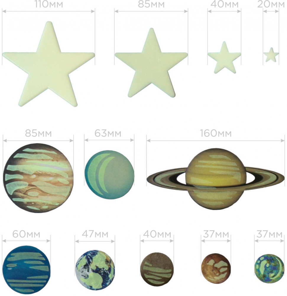 Нам этот набор очень понравился и я его смело порекомендовала бы тем, чьи дети изучают звёздное небо и хотят создать немного ночного неба у себя в комнате. Планеты реалистичные, размеры соблюдены, тоже светятся в темноте. Мы сделали несколько созвездий из маленьких звёздочек и смотрятся они шикарно. В общем, рекомендую.