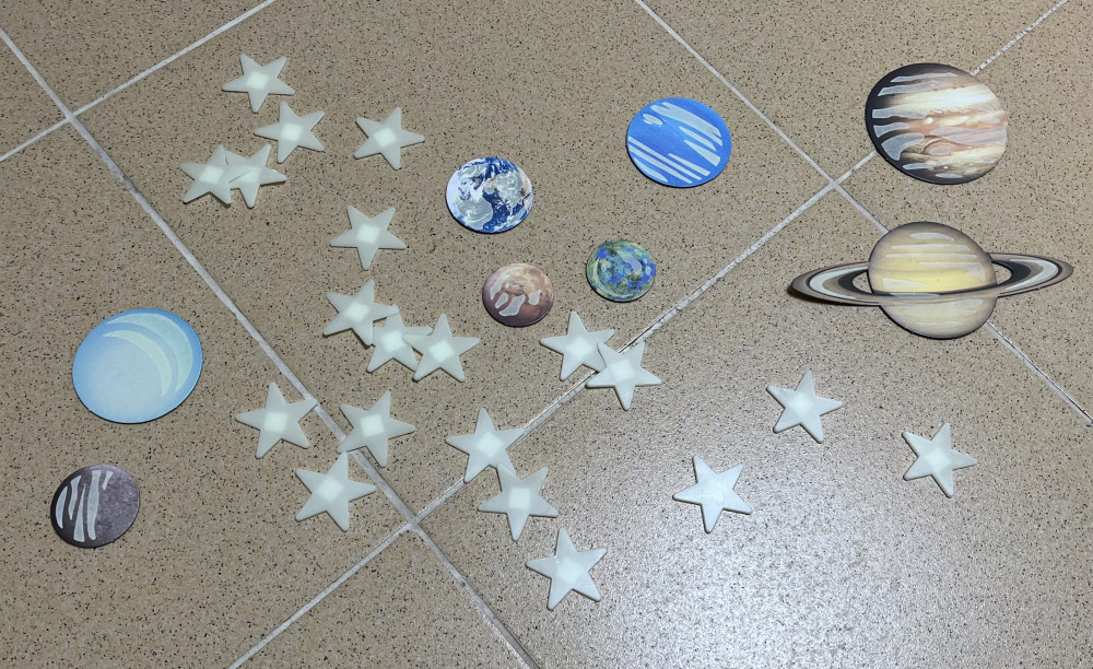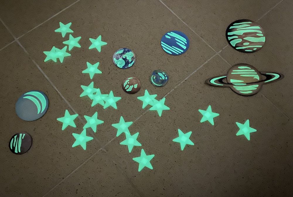 Классный набор звезд и планет. 4-х летний ребенок почти сам наклеил двусторонним скотчем, который имеется в наборе, изучил новые планеты и ждет наступления ночи, чтобы любоваться звездным небом и парадом планет. Рекомендую!