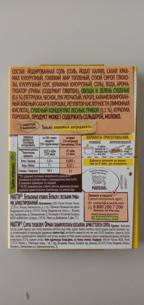 💳 Оплатить за товар можно при получении 🇰🇿 Есть бесплатная доставка по Казахстану от 1 дня 🎁 Копите бонусы с каждой покупки В бульонном кубике идеально сбалансированы пряности, специи, соль и ароматные лесные грибы. А натуральные овощи и зелень придадут блюду аппетитный внешний вид. Идеальное дополнение к вашим любимым грибным блюдам. В составе кубиков Maggi теперь только знакомые ингредиенты. Производятся без добавления искусственных консервантов, а количество соли ровно столько, сколько нужно для готового блюда. Не досаливайте блюда дополнительно без лишней необходимости, так как оптимальное содержание соли в рационе очень важно для здоровья организма. |