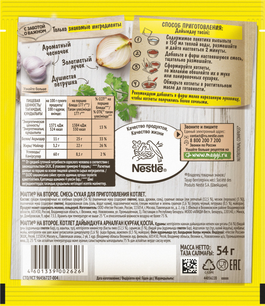 💳 Оплатить за товар можно при получении 🇰🇿 Есть бесплатная доставка по Казахстану от 1 дня 🎁 Копите бонусы с каждой покупки Серия: На Второе Нежные, сочные, ароматные котлеты — любимое блюдо из детства. У всех, конечно же, есть свой проверенный семейный рецепт. MAGGI На второе для котлет предлагает по-новому взглянуть на привычное блюдо и попробовать замечательный рецепт котлет для приготовления без лишних хлопот. Уникальная композиция натуральных овощей, ароматных трав и пряных специй и пошаговая инструкция помогут вам приготовить гарантировано вкусное блюдо на обед или ужин для всей семьи. |