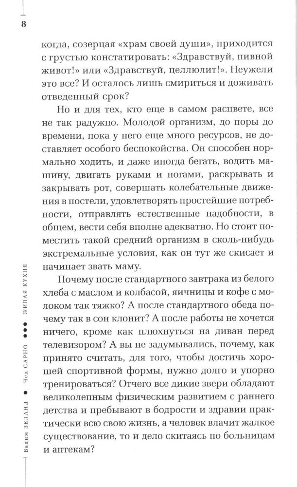 Книга про здоровый образ жизни и сыроедение. Вот собственно её суть. Идея сами понимаете очень не нова, миллион раз всё это уже говорилось и писалось и разных книг издавалось, сыроедение оно и есть сыроедение, это далеко не ноухау, но если бы книгу назвали просто "О сыроедениии" на вряд ли она бы вызвала такую волну ажиотажа )))) Подача самого Зеланда только несколько специфична (но на то он и Зеланд, а не просто врач-диетолог, или поборник здорового образа жизни), очень проста как будто разговор на кухне между старыми знакомыми, в этом ее прелесть. Читать интересно именно благодаря подачи автора. Понравиться всем поклонникам Зеланда и всем поклонникам сыроедения. Если кто сильно отрицательно к этой системе настроен лучше не читать, чтобы не брызгать слюнями протеста )))