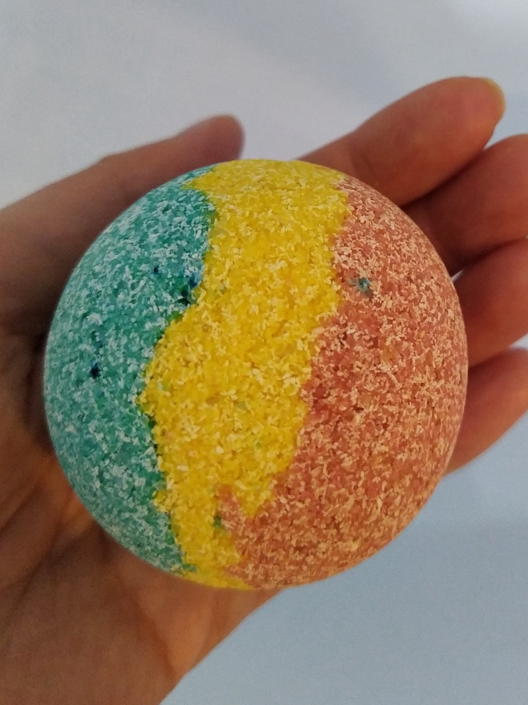 Заказывала радужную бомбочку, после распаковки оказалась трехцветной. После растворения вода в ванной разделилась на 3 цвета, было прикольно. запах шикарный, напоминает дюшес.