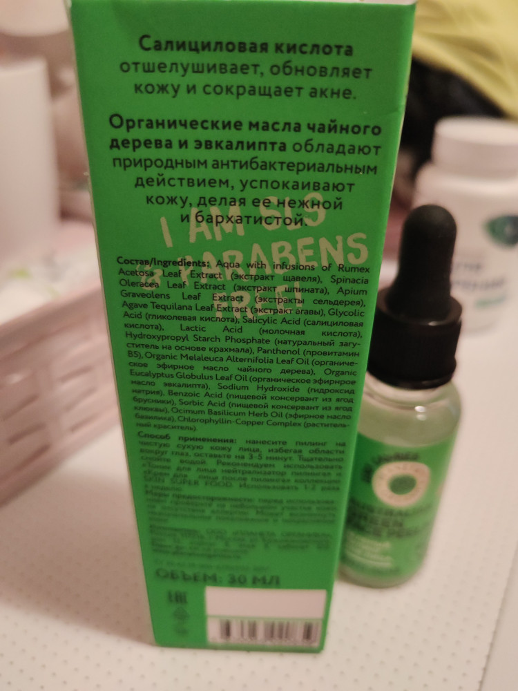 Зеленый пилинг для лица, объем 30 мл. Состав натуральный (мне главное чтобы работало). После умывания перед тоником использую. Пока тестирую.