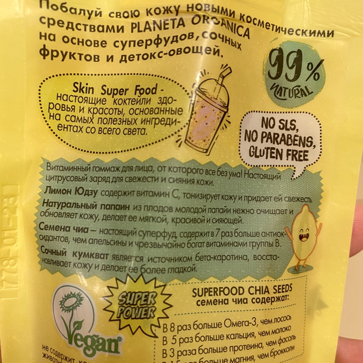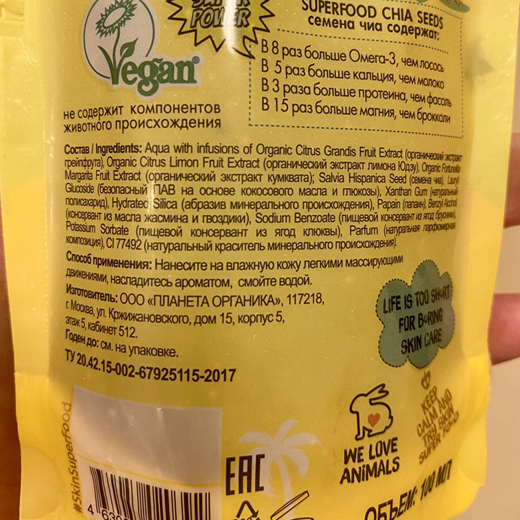 Кроме крупных семян есть мелкие включения, которые работают как скраб. Аромат так себе, насладиться им, как рекомендуют производители, мне не удалось)))