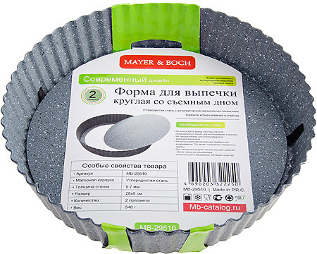 Mayer & Boch Форма для выпечки со съемным дномВ данный момент этот товар отсутствует в продаже. Возможно, у нас найдется аналогичный или похожий товар здесь. Форма со съемным дном от «Mayer&Boch» изготовлена из высококачественной углеродистой стали с антипригарным мраморным покрытием. Толщина изделия составляет 7 мм, что обеспечивает изделию долговечность. Основной плюс посуды этого типа заключается в том, что эта посуда не перегревается, соответственно не разрушается антипригарный слой. Мраморное покрытие делает возможным приготовление блюд без масла. Оно обладает повышенной стойкостью к царапинам и внешним воздействиям. Такая посуда незаменима для приготовления запеканок, всевозможных блюд из мяса и овощей, а также выпечки из теста и изысканных кондитерских блюд. Подходит для использования в духовках. Подходит для мытья в посудомоечной машине. |