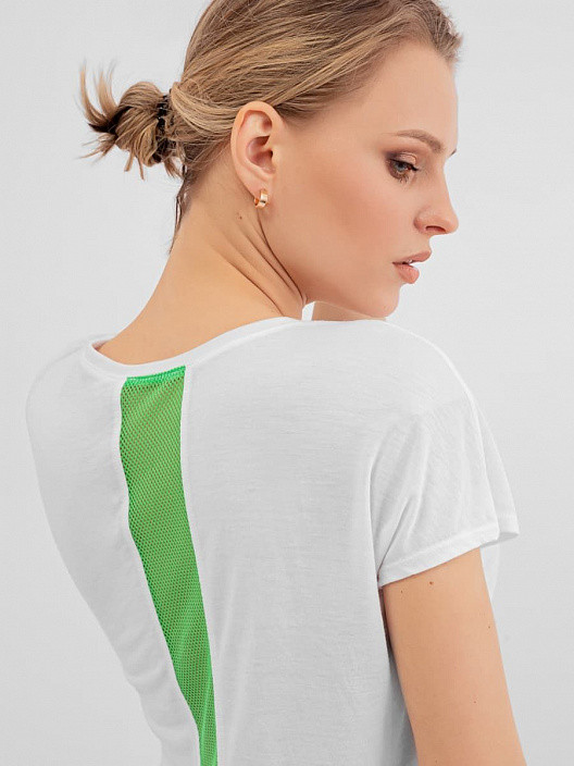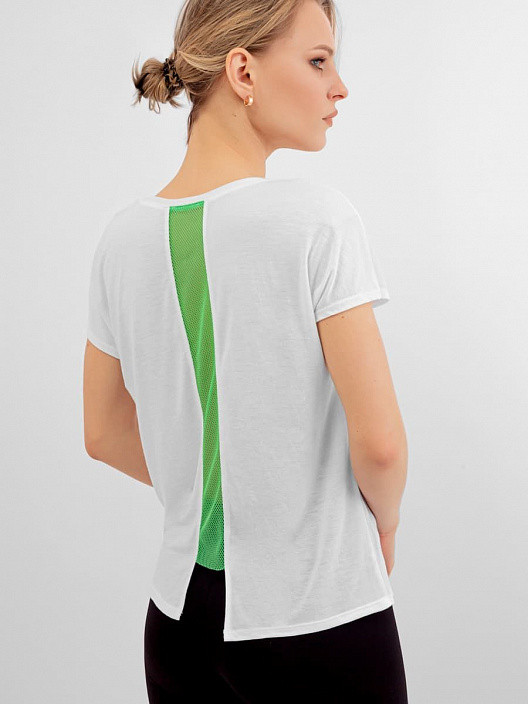 Футболка полностью соответствует фотографии и описанию на сайте. Тоненькая, струящаяся. С вставкой из сетки на спинке.