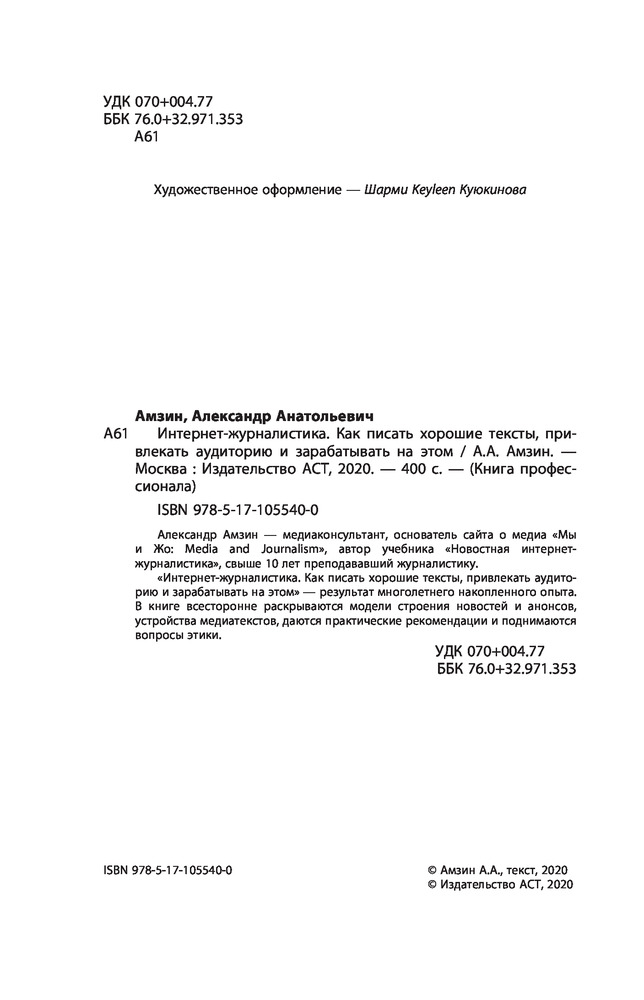 💳 Оплатить за товар можно при получении 🇰🇿 Есть бесплатная доставка по Казахстану 🎁 Копите бонусы с каждой покупки Серия: Книга профессионала Александр Амзин — медиаконсультант, основатель сайта о медиа «Мы и Жо: Media and Journalism», автор учебника «Новостная интернет-журналистика», свыше 10 лет преподававший журналистику. «Интернет-журналистика. Как писать хорошие тексты, привлекать аудиторию и зарабатывать на этом» — результат многолетнего накопленного опыта. В книге всесторонне раскрываются модели строения новостей и анонсов, устройства медиатекстов, даются практические рекомендации и поднимаются вопросы этики. |