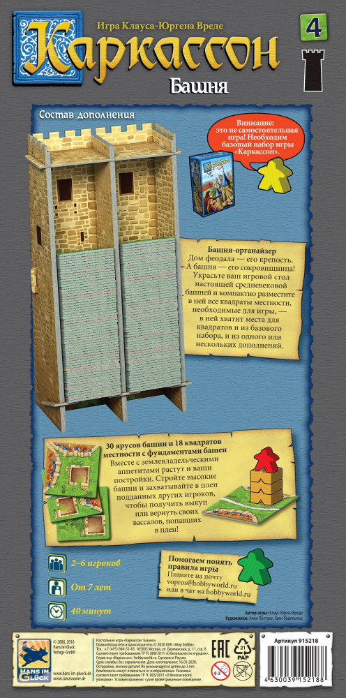 Hobby World Дополнение «Каркассон 4. Башня»В данный момент этот товар отсутствует в продаже. Возможно, у нас найдется аналогичный или похожий товар здесь. Серия: Каркассон В дополнении «Башня» появляется собственно башня-органайзер. Её необходимо собрать перед началом самой первой игры с дополнением. В башню поместятся как квадраты местности дополнения, так и базовой игры. Впоследствии башню можно не разбирать и использовать как место хранения карт. Также в дополнении вас ожидают 18 квадратов местности с фундаментами башен. Ибо крепость не крепость без башни. Это и предмет гордости каждого отдельного феодала, и хранилище драгоценностей. Не ограничивайтесь постройкой одной башни. Чем больше башен вам удастся возвести, тем проще вам брать в плен подданных соперников и освобождать своих собственных вассалов. Дополнение «Башня», как обычно, прекрасно сочетается с прочими дополнениями базовой игры. В игре побеждает игрок, набравший наибольшее количество победных очков. |
