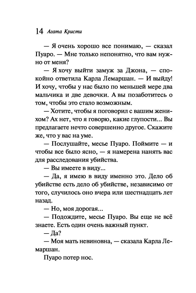 💳 Оплатить за товар можно при получении 🇰🇿 Есть бесплатная доставка по Казахстану от 1 дня 🎁 Копите бонусы с каждой покупки Серия: Агата Кристи. Любимая коллекция К знаменитому сыщику Эркюлю Пуаро обращается молодая женщина по имени Карла, мать которой шестнадцать лет назад была осуждена за убийство собственного мужа. Ныне Карла собирается выйти замуж и опасается, что дела давно минувших лет могут разрушить её личную жизнь. При этом она утверждает, что мать никогда не стала бы лгать ей. А та ещё шестнадцать лет назад сказала, что невиновна... Пуаро, увлеченный сложностью загадки, берется за дело — и выясняет, что подозревать в убийстве можно еще пять человек. И, хотя прошло столько времени, а вина матери Карлы считается доказанной, мощный интеллект Пуаро берется за работу... |