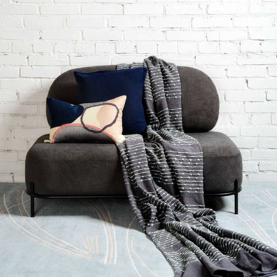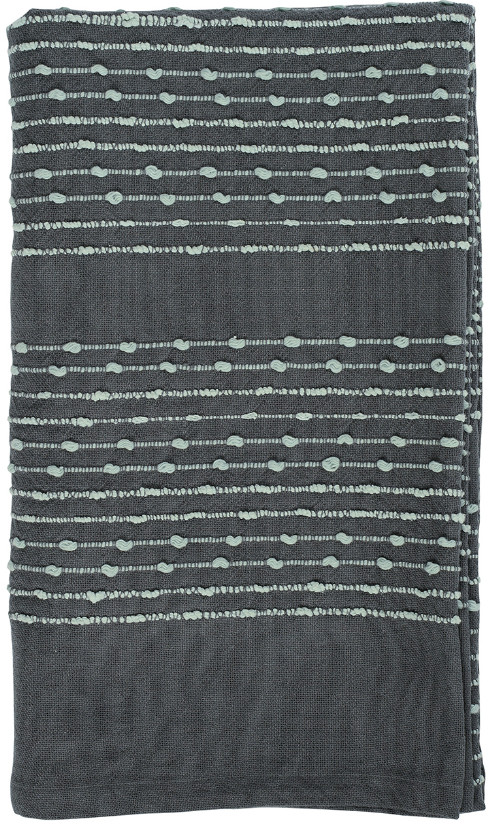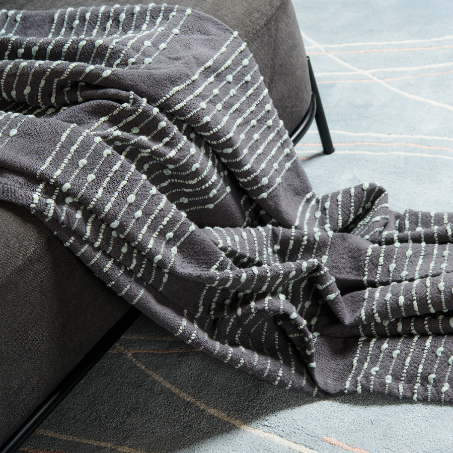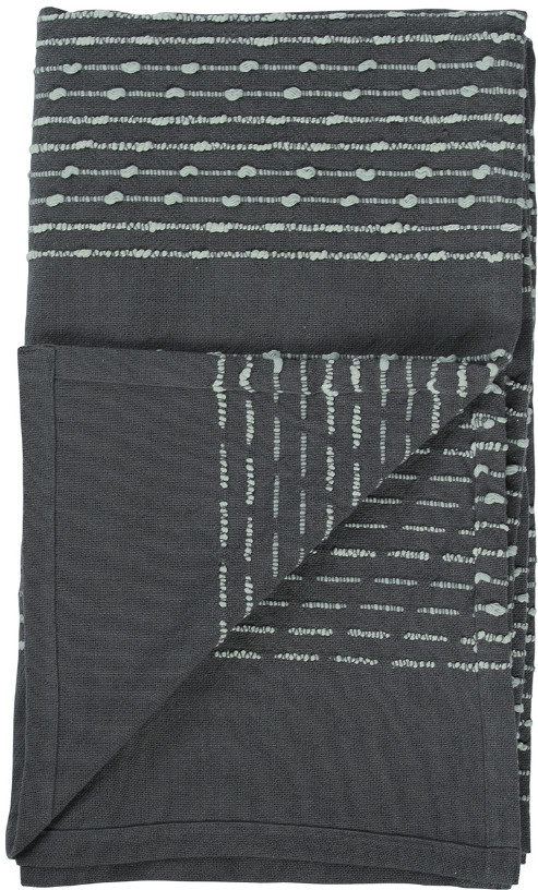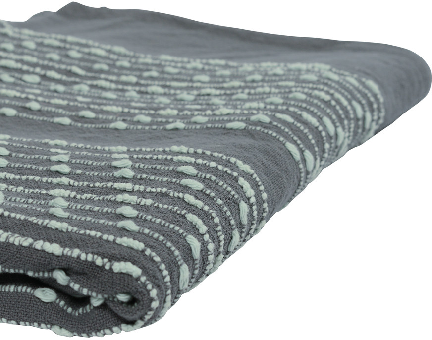 Плед из достаточно плотной и в то же время мягкой ткани,100% хлопок, благородного серого цвета с вкраплениями светлых строчек. Очень красивый и приятный на ощупь