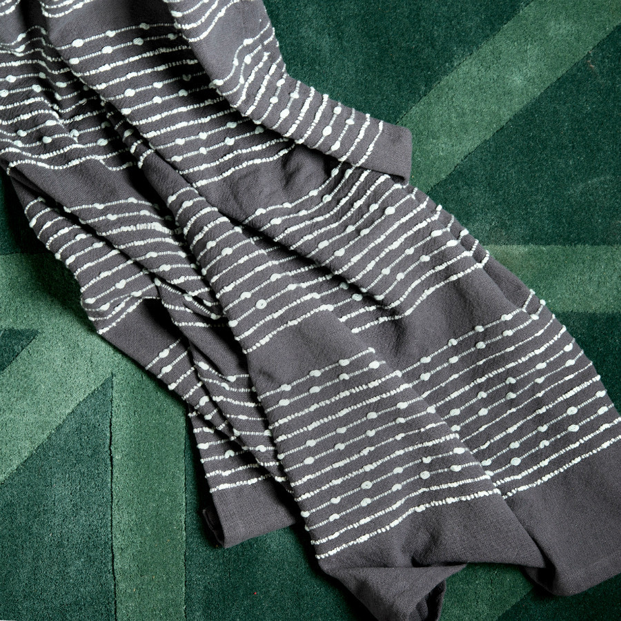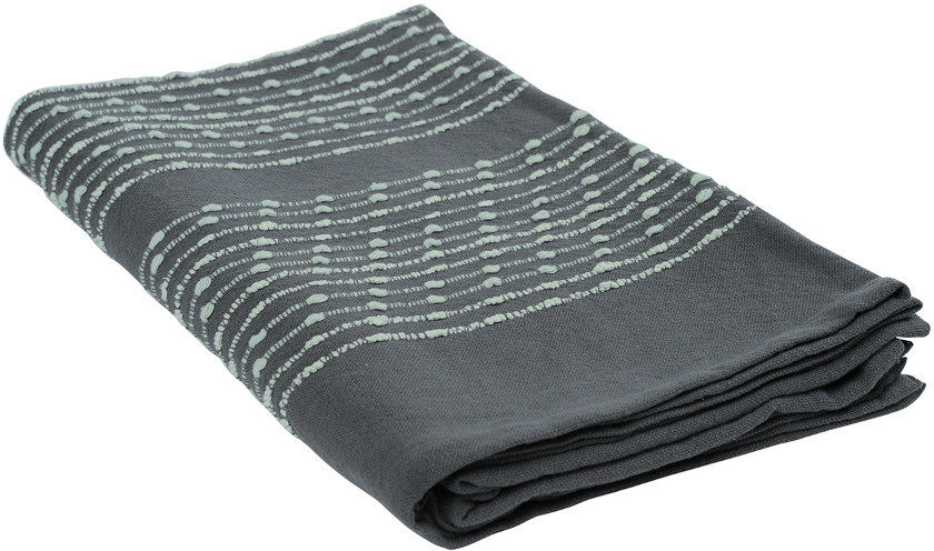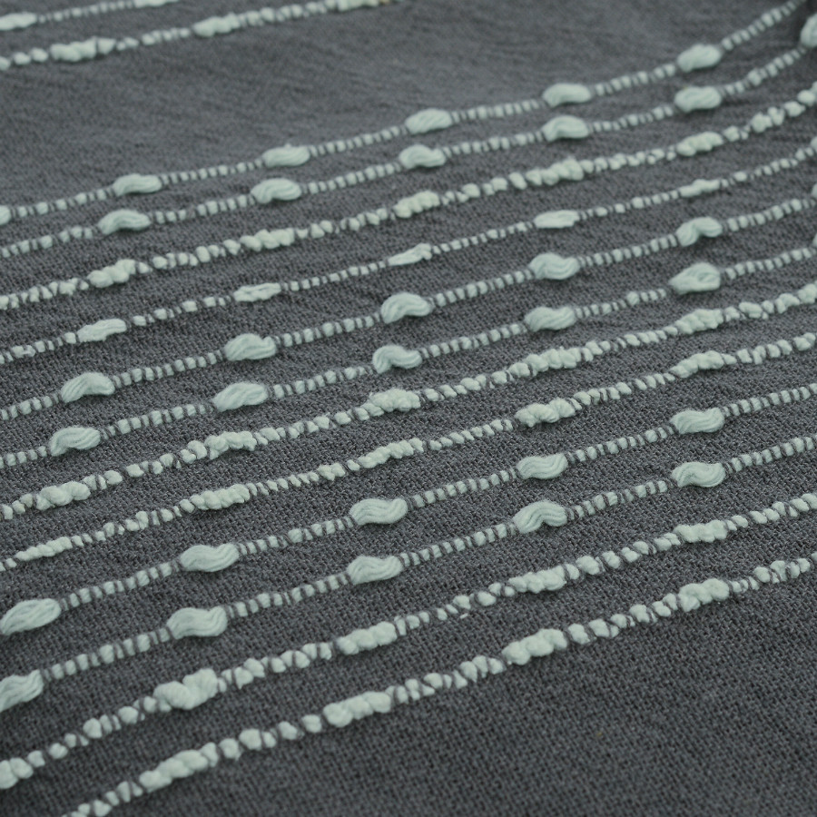 Плед из достаточно плотной и в то же время мягкой ткани,100% хлопок, благородного серого цвета с вкраплениями светлых строчек. Очень красивый и приятный на ощупь