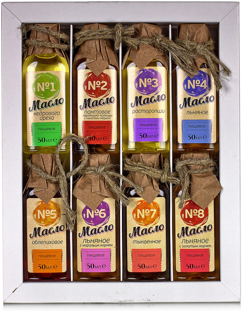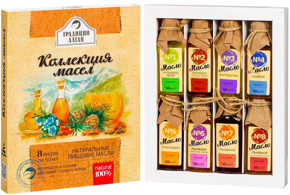 набор масел подарочная упаковка вязкая консистенция тыквенный вкус В данный момент этот товар отсутствует в продаже. Возможно, у нас найдется аналогичный или похожий товар здесь. Серия: Традиции Алтая В набор входит 8 видов натуральных алтайских масел: