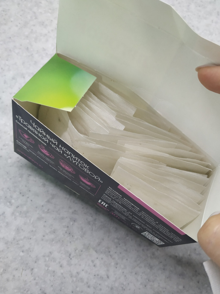 Коробка вся была в пыли, как выяснилось такой же "чай" из пыли внутри, что говорит о плохом качестве. Всё дёшево от упаковки до содержания. Никакого удовольствия от чаепития не получила.