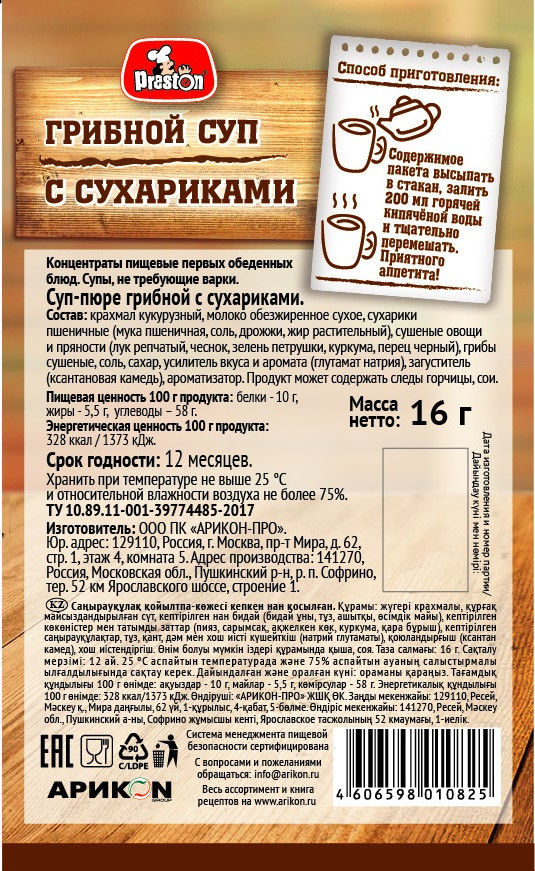 Любителям куринных кубиков. Такое только в дорогу сгодится. В общем высыпаете белый порошок с сухариками и мешаете ложкой чтобы не было комков, потому что это крахмал с сухим молоком и ароматизатором грибов. Сушеные кусочки грибов есть, но за эту цену вкуснее лапшу заворочную съесть.