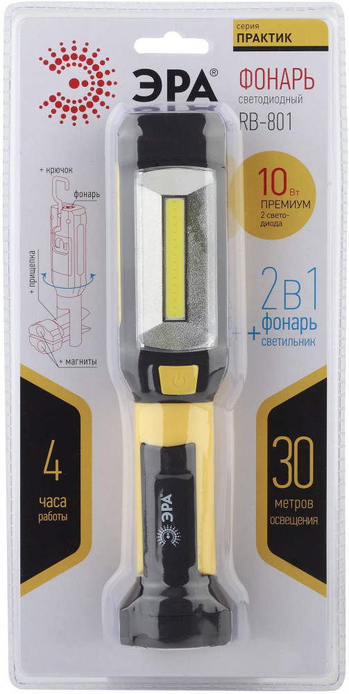 💳 Оплатить за товар можно при получении 🇰🇿 Есть бесплатная доставка по Казахстану от 1 дня 🎁 Копите бонусы с каждой покупки Серия: Практик Светодиодный фонарь Эра RB-801 — многофункциональный рабочий фонарь с покрытием софт-тач для удобного захвата. Фонарь оборудован двумя светодиодами: 3 Вт в верхней части корпуса и 5 Вт COB диод (Chip-On-Board — чип на плате). В корпус встроен складывающийся крючок и магнит. Клипса в основании крепится на любую поверхность и вращается на 720 градусов. |