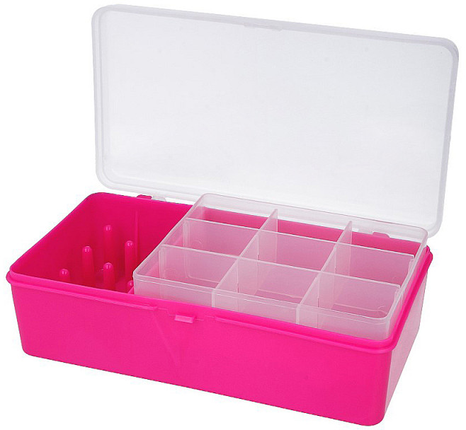 Коробка для организованного хранения швейных принадлежностей. В коробке — 9 держателей для катушек, а также вкладыш из прозрачного пластика с 9 ячейками. Такой контейнер поможет держать вещи в порядке. Контейнер для организованного хранения бисера, стекляруса, бусин, пуговиц, фурнитуры и других мелочей.
