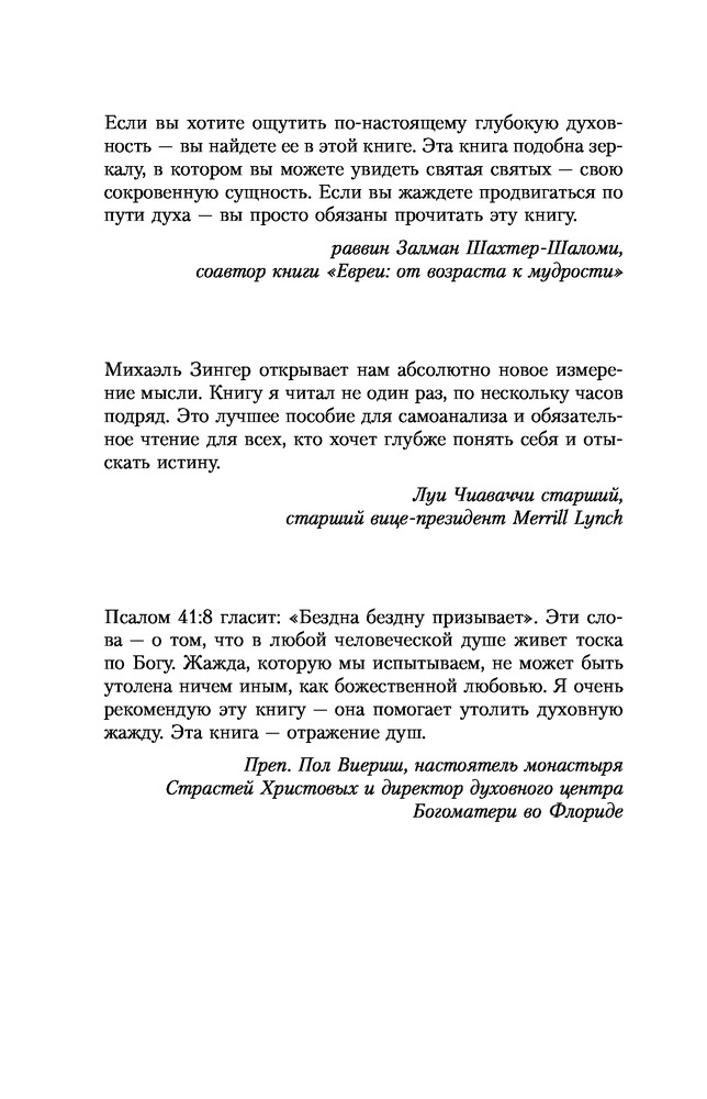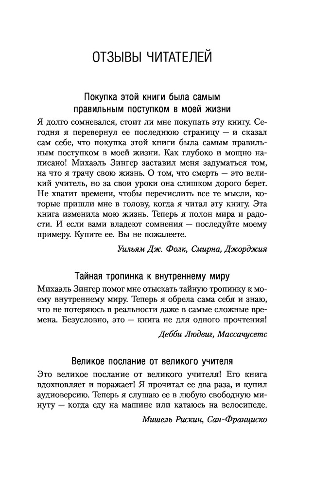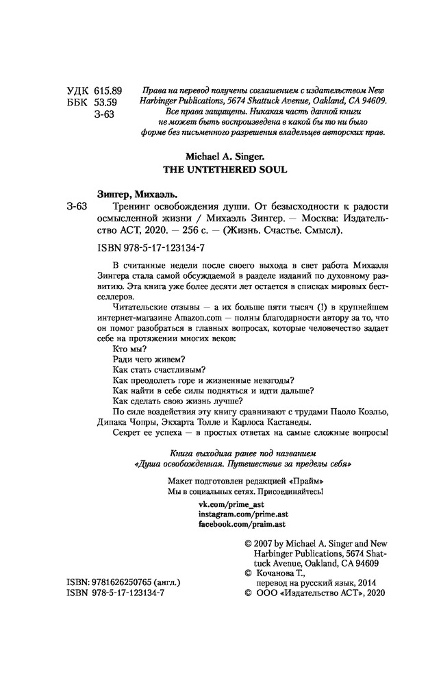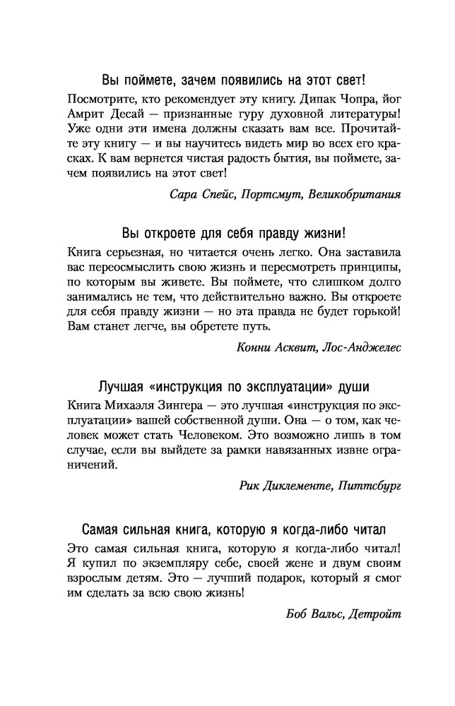 Тренинг освобождения души. От безысходности к радости осмысленной жизниВ данный момент этот товар отсутствует в продаже. Возможно, у нас найдется аналогичный или похожий товар здесь. Серия: Жизнь. Счастье. Смысл В считанные недели после своего выхода в свет работа Михаэля Зингера стала самой обсуждаемой в разделе изданий по духовному развитию. Эта книга уже более десяти лет остается в списках мировых бестселлеров. Читательские отзывы — а их больше пяти тысяч (!) в крупнейшем интернет-магазине Amazon.com — полны благодарности автору за то, что он помог разобраться в главных вопросах, которые человечество задает себе на протяжении многих веков: Кто мы? Ради чего живем? Как стать счастливым? Как преодолеть горе и жизненные невзгоды? Как найти в себе силы подняться и идти дальше? Как сделать свою жизнь лучше? По силе воздействия эту книгу сравнивают с трудами Паоло Коэльо, Дипака Чопры, Экхарта Толле и Карлоса Кастанеды. Секрет ее успеха — в простых ответах на самые сложные вопросы! |