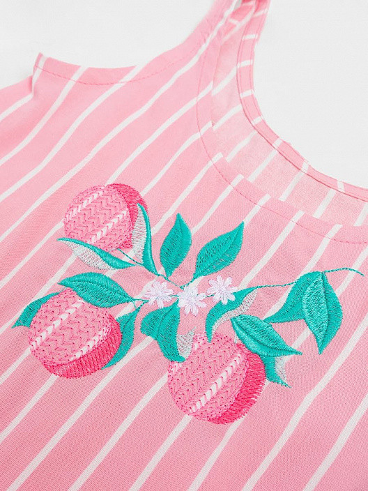Сарафан просто прелесть! Тонкий, легкий шпатель. Не согласна с критическим замечанием на счет просвечивания ткани- это летний детский (!) сарафан, а дети бюсгалтер не носят, что там просветит? отпарила и получила такую красоту! вышивка качественная. Цвет- изумительный персиково розовый в белую полоску. Очень довольны. Рекомендую