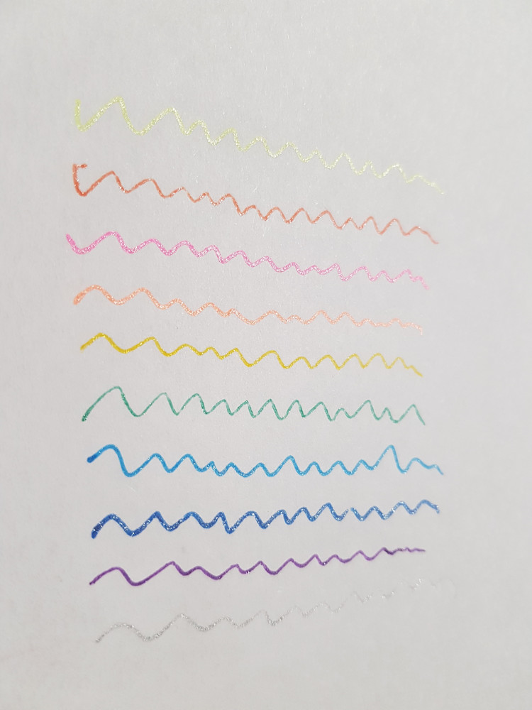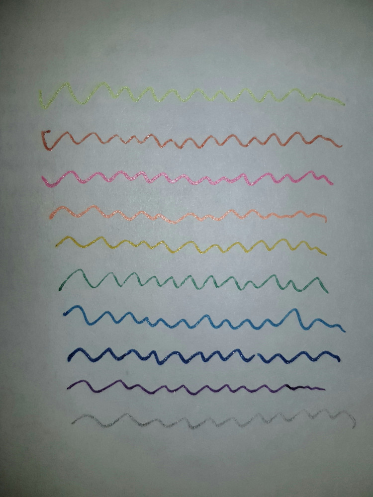 Корпус из гладкого, приятного пластика с едва заметным глиттерным напылением, прозрачные крышечки имеют мелкие блёстки внутри. Чернила яркие, мерцающие частички весьма крупные. При штриховке не так сильно полосит как дешёвые аналоги. В первые минуты после письма может размазаться, если бумага слишком гладкая, и это единственный минус.