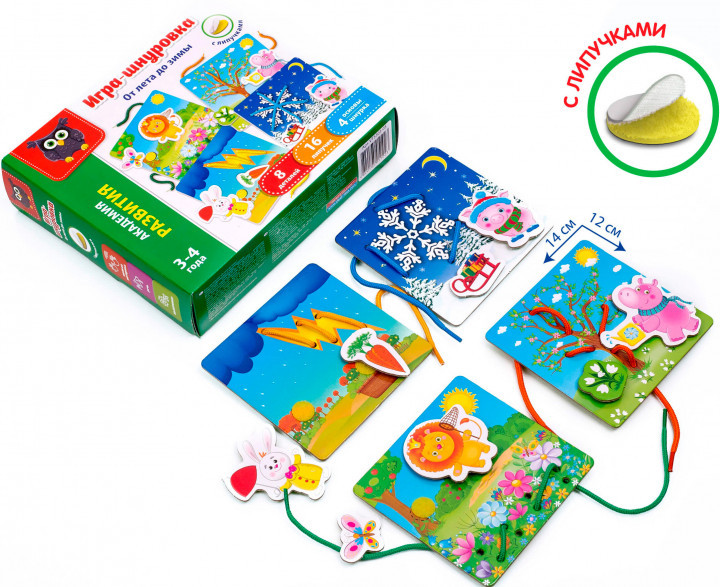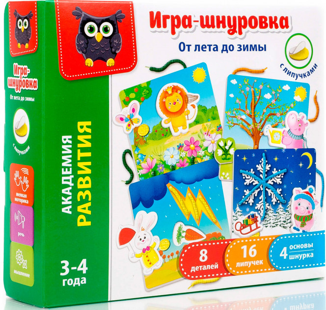 Vladi Toys Игра-шнуровка с липучками «От лета до зимы»В данный момент этот товар отсутствует в продаже. Возможно, у нас найдется аналогичный или похожий товар здесь. Серия: Академия развития Времена года бывают такие разные. Весна, лето, осень, зима — все они имеют свои особенности. Игра «От лета до зимы» познакомит малыша с этими особенностями. |