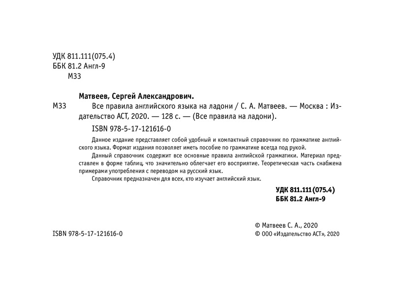 💳 Оплатить за товар можно при получении 🇰🇿 Есть бесплатная доставка по Казахстану от 1 дня 🎁 Копите бонусы с каждой покупки Серия: Все правила на ладони Данное издание представляет собой удобный и компактный справочник по грамматике английского языка. Формат издания позволяет иметь пособие по грамматике всегда под рукой. Данный справочник содержит все основные правила английской грамматики. Материал представлен в форме таблиц, что значительно облегчает его восприятие. Теоретическая часть снабжена примерами употребления с переводом на русский язык. Справочник предназначен для всех, кто изучает английский язык. |