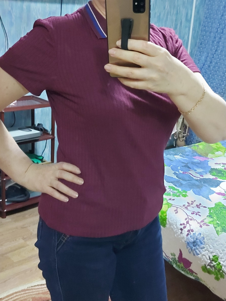 Обожаю такую ткань- как будто "резинкой " вывязана, но при этом трикотаж. Очень мягкая и приятная. Цвет и правда, бордовый, а не как на фото, но это огромный плюс, бордовый мне идет. Цена замечательная.