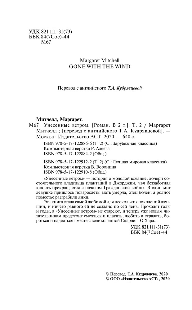 💳 Оплатить за товар можно при получении 🇰🇿 Есть бесплатная доставка по Казахстану от 1 дня 🎁 Копите бонусы с каждой покупки Серия: Лучшая мировая классика Маргарет Митчелл (1900 — 1949) — американская писательница, автор романа «Унесённые ветром», вышедшего в 1936 году и получившего Пулитцеровскую премию. Книга имела невероятный успех у читателей, а экранизация с Вивьен Ли и Кларком Гейблом в главных ролях завоевала восемь премий «Оскар» и стала одной из самых знаменитых лент в истории мирового кинематографа. «Унесенные ветром» — история о молодой южанке, дочери состоятельного владельца плантаций в Джорджии, чья беззаботная юность прекращается с началом Гражданской войны. В один миг девушке пришлось повзрослеть: мать умерла, отец болен, а родное поместье разграбили янки. Эта книга стала самой любимой для нескольких поколений женщин, и ничего равного ей не создано по сей день. Проходят годы и годы, а «Унесенные ветром» не стареют, и теперь уже новым читательницам предстоит смеяться и плакать, любить и страдать, бороться и надеяться вместе с великолепной Скарлетт О’Хара... |