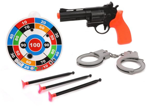 Наша игрушка Набор игровой «Полиция»В данный момент этот товар отсутствует в продаже. Возможно, у нас найдется аналогичный или похожий товар здесь. Игровой набор «Полиция» поможет ребёнку придумать множество сюжетов для увлекательной игры! В комплекте — пистолет, 3 стрелы на присосках, наручники — открываются и закрываются без ключа, круглая мишень, поделённая на сектора с очками. Стрелы поочерёдно устанавливаются в дуло игрушечного оружия, выстрел осуществляется нажатием на курок. |