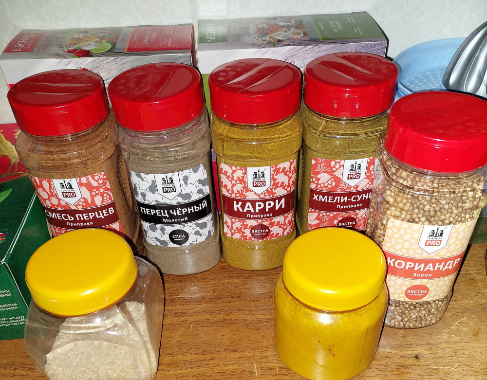 Много приобрела приправ этой фирмы в банках. Банки удобные, с крышкой разделённой на две части, можно открыть одну сторону, там для ложки и вторая сторона сыпучая. Приправы отличные, ароматные, не пыль, дающие замечательный вкус. Спасибо сайту и производителю! На фото не весь состав)