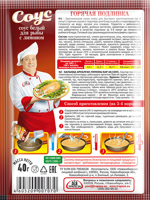 Трапеза Соус белый для рыбы с лимономвкусный понравился нет недостатков В данный момент этот товар отсутствует в продаже. Возможно, у нас найдется аналогичный или похожий товар здесь. Оригинальная сухая смесь для быстрого приготовления (за 5 минут) горячих пряных соусов и подливок для блюд из рыбы. Соус готовится на воде или несоленом мясном бульоне. Подается к запеченной, жаренной, отварной рыбе, рыбным котлетам или добавляется в качестве подливки за 3-5 минут до готовности рыбного блюда. Готовый соус рекомендуется использовать в горячем виде. |