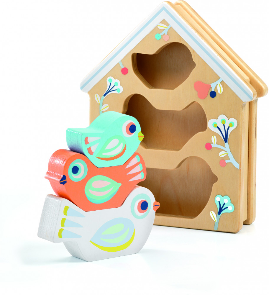 Деревянная многофункциональная игрушка-сортер Птички от французского бренда Djeco состоит из домика-скворечника и деревянных птиц разного размера.