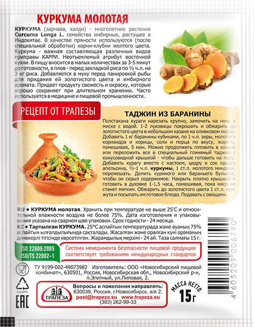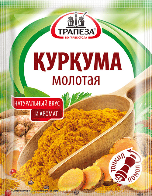 Куркума — очень распространенная пряность, содержащая много минеральных веществ и витаминов, употребление ее в пищу способствует здоровой и долгой жизни. Используется не только как пряность, но и как пищевой краситель, имеет слабый пряный аромат, близкий к имбирному. Куркума — отличная приправа для плова, куриного бульона, овощных салатов, соусов, омлетов, супов. Особенно хороша в блюдах из риса. Используется при выпечке, придавая мучным изделиям золотистый цвет. Сочетается со всеми пряностями.