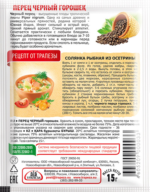 Приправа Трапеза всегда качественная .Зернышки перца нормальные,аромат присутствует,перцовой пыли в пакете не было.Рекомендую
