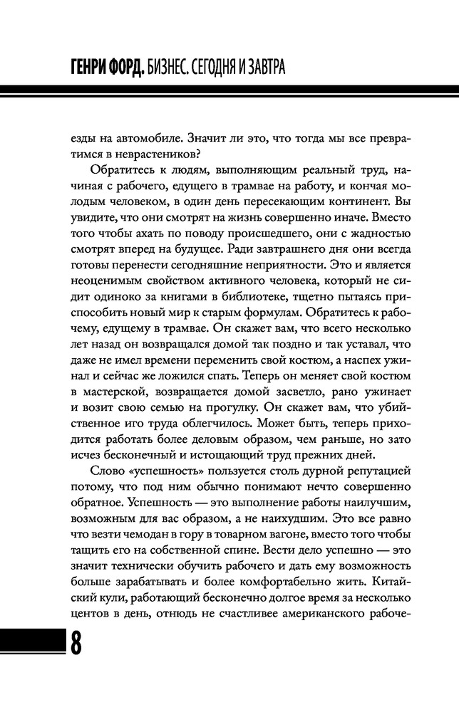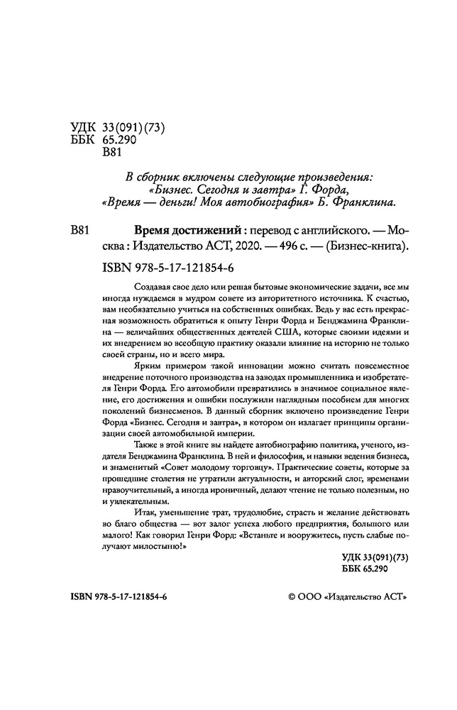 Время достиженийГенри Форд, Бенджамин Франклин В данный момент этот товар отсутствует в продаже. Возможно, у нас найдется аналогичный или похожий товар здесь. Серия: Бизнес-книга Создавая свое дело или решая бытовые экономические задачи, все мы иногда нуждаемся в мудром совете из авторитетного источника. К счастью, вам необязательно учиться на собственных ошибках. Ведь у вас есть прекрасная возможность обратиться к опыту Генри Форда и Бенджамина Франклина — величайших общественных деятелей США, которые своими идеями и их внедрением во всеобщую практику оказали влияние на историю не только своей страны, но и всего мира. Ярким примером такой инновации можно считать повсеместное внедрение поточного производства на заводах промышленника и изобретателя Генри Форда. Его автомобили превратились в значимое социальное явление, его достижения и ошибки послужили наглядным пособием для многих поколений бизнесменов. В данный сборник включено произведение Генри Форда «Бизнес. Сегодня и завтра», в котором он излагает принципы организации своей автомобильной империи. Также в этой книге вы найдете автобиографию политика, ученого, издателя Бенджамина Франклина. В ней и философия, и навыки ведения бизнеса, и знаменитый «Совет молодому торговцу». Практические советы, которые за прошедшие столетия не утратили актуальности, и авторский слог, временами нравоучительный, а иногда ироничный, делают чтение не только полезным, но и увлекательным. Итак, уменьшение трат, трудолюбие, страсть и желание действовать во благо общества — вот залог успеха любого предприятия, большого или малого! Как говорил Генри Форд: "Встаньте и вооружитесь, пусть слабые получают милостыню!" |