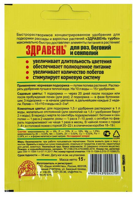 Ваше хозяйство Удобрение для роз, бегоний и сенполийВ данный момент этот товар отсутствует в продаже. Возможно, у нас найдется аналогичный или похожий товар здесь. Серия: Здравень-турбо Удобрение для роз, бегоний и сенполий «Здравень-турбо» — специализированные удобрения для подкормки отдельных видов комнатных цветов: увеличивает длительность цветения, обеспечивает полноценное питание, увеличивает количество побегов, стимулирует корневую систему. |