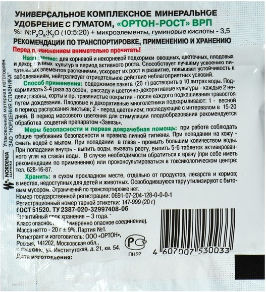 Ортон Удобрение универсальное «Рост»В данный момент этот товар отсутствует в продаже. Возможно, у нас найдется аналогичный или похожий товар здесь. Для подкормки всех культур на протяжении всего вегетационного периода. Активные вещества: N:P2О5:К2О-10:5:20 + микроэлементы, гуминовые кислоты — 3,5. |