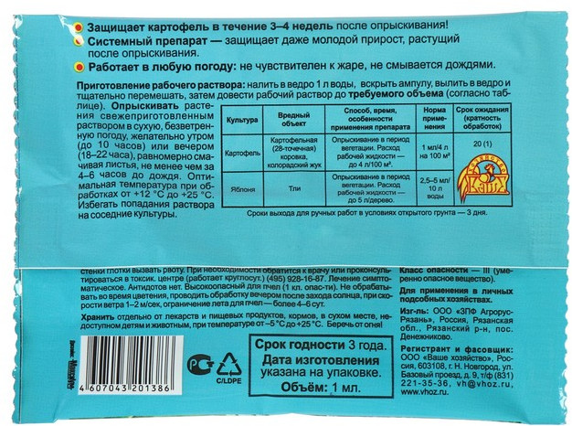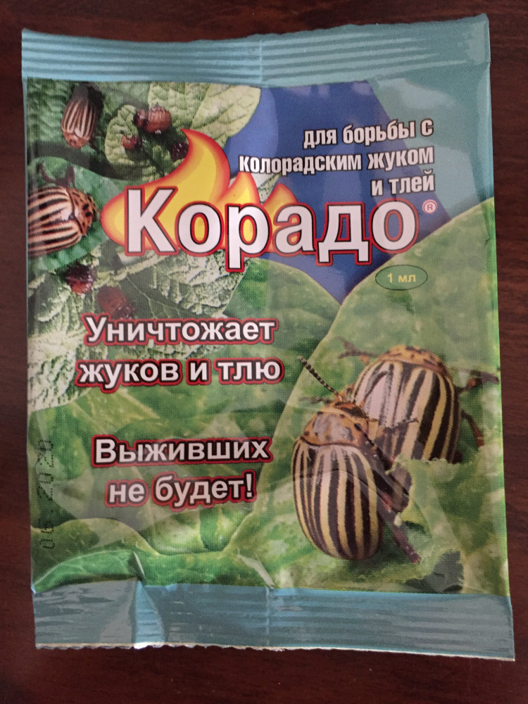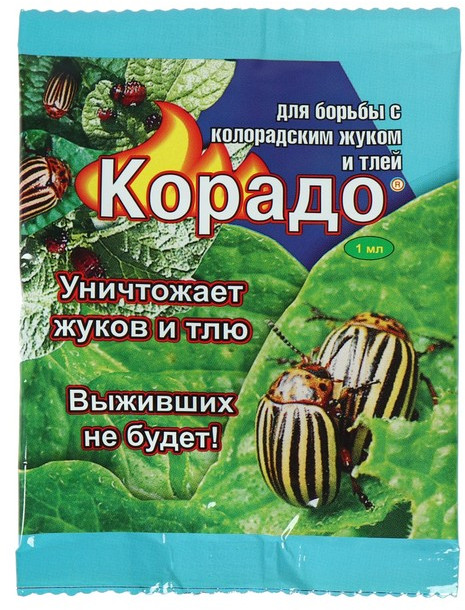 Средство «Корадо» поможет защитить растения от картофельной коровки, колорадского жука и тли. Достаточно однократно обработать растения в период вегетации раствором препарата для того, чтобы обеспечить 100% уничтожение взрослых жуков и личинок всех возрастов. Одной упаковки хватит на обработку 100 м2 картофельного поля или 2 яблоневых деревьев. «Корадо» — это настоящая находка для любого садовода, ведь эффективность воздействия препарата не зависит от погодных условий. Преимущества: