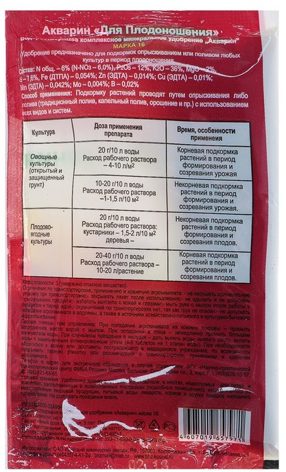 💳 Оплатить за товар можно при получении 🇰🇿 Есть бесплатная доставка по Казахстану от 1 дня 🎁 Копите бонусы с каждой покупки «Акварин для плодоношения» — это уникальное водорастворимое удобрение с оптимально сбалансированным комплексом макро- и микроэлементов. Оно предназначено для подкормок овощных и декоративных растений, вступающих в фазу плодоношения. Средство представляет собой смесь гранул и порошка бело-зелёного цвета. |