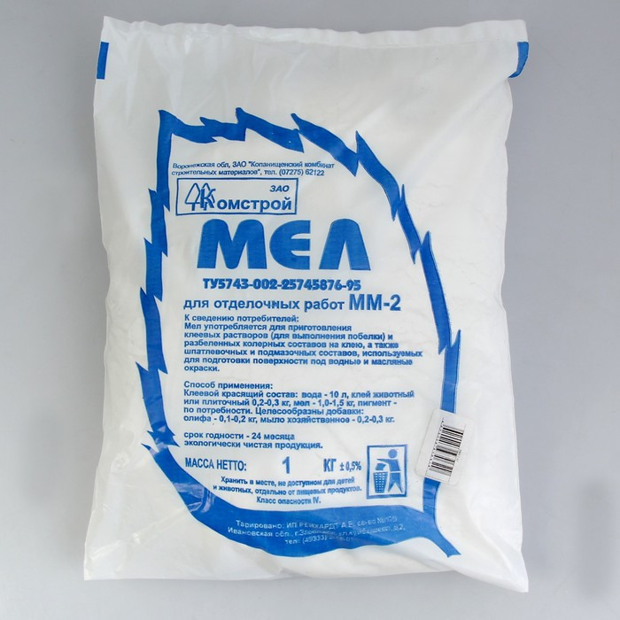 Мел как мука. Упаковка крепкая- пакет, по внешнему виду приходили разного дизайна. Указано мел строительный. Вношу в землю осенью.