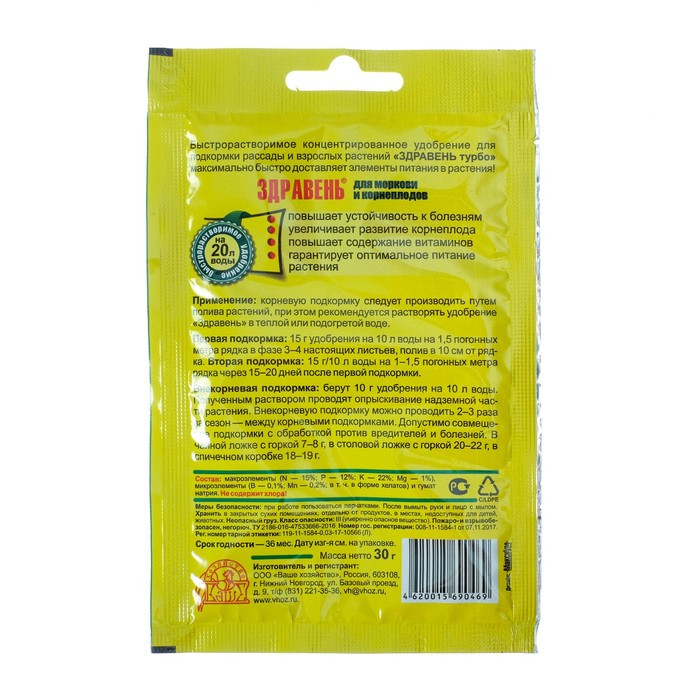 💳 Оплатить за товар можно при получении 🇰🇿 Есть бесплатная доставка по Казахстану от 1 дня 🎁 Копите бонусы с каждой покупки Серия: Здравень-турбо Удобрение для моркови и корнеплодов «Здравень-турбо» — ускоряет сроки созревания урожая, увеличивает число завязей и зеленцов, значительно поднимает урожайность, повышает содержание витаминов, улучшает салатные и засолочные свойства. |